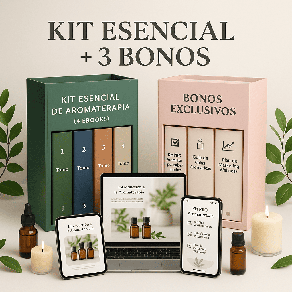 Las 4 guías del Kit Esencial de Aromaterapia, más 3 bonos exclusivos: kit PRO aromaterapia imprimible, guía de velas y plan de marketing wellness.